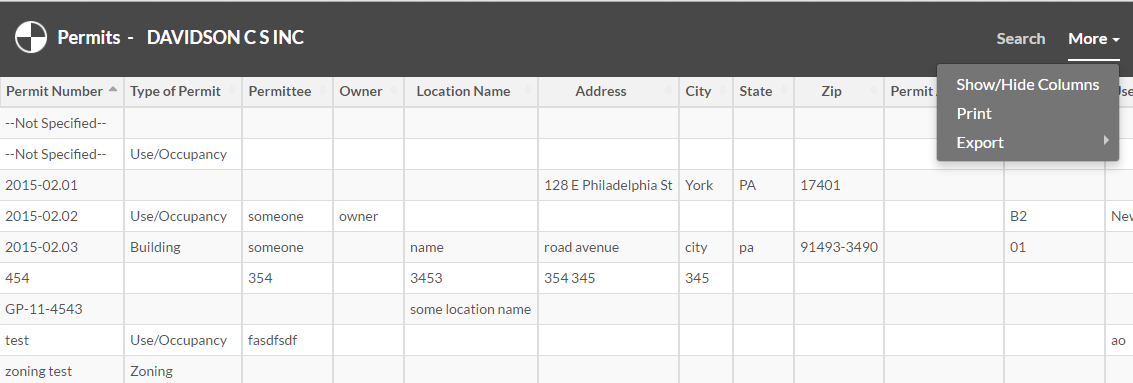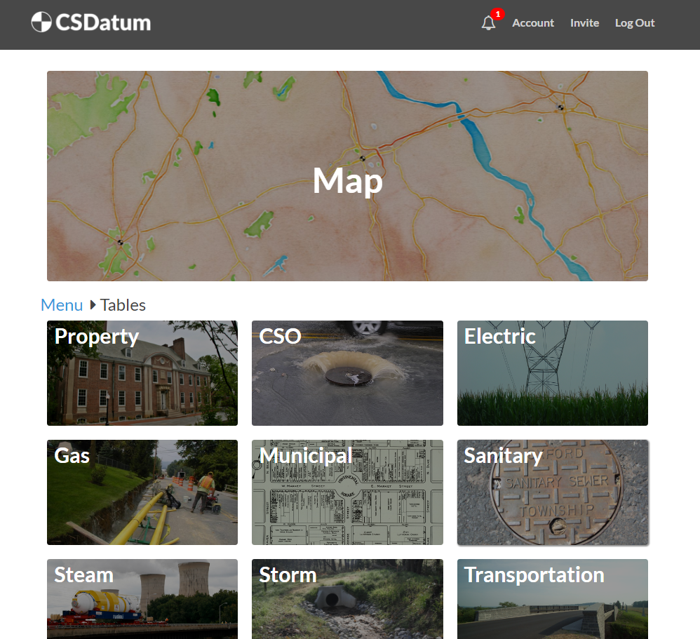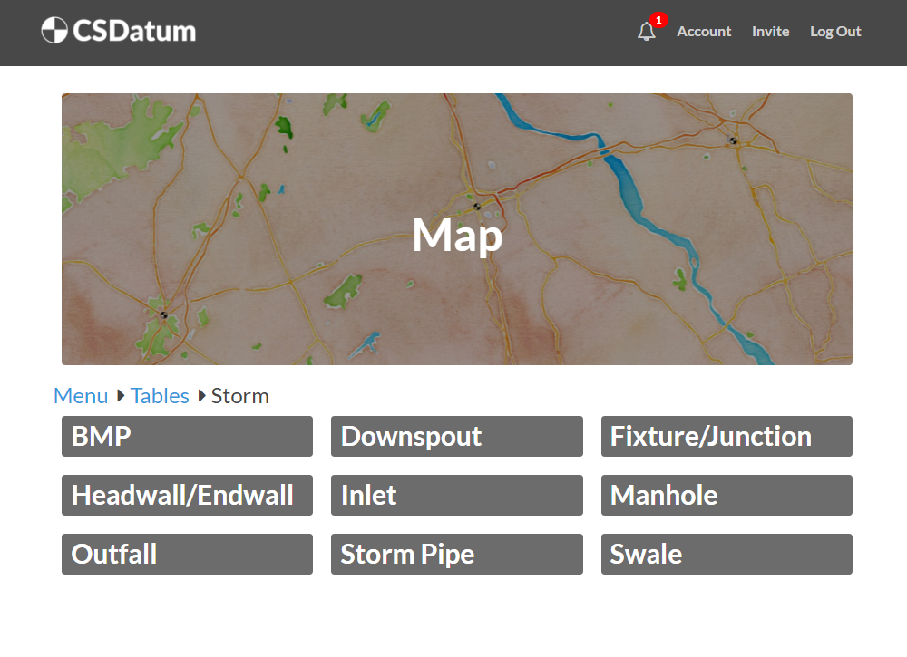 You can now view all the data you've meticulously entered on the map - but in table or list form! I've joked about this before...but think of a big, interactive spreadsheet for all of your stormwater BMPs, signs, building permits & more. Sort it, search it, print it - you get the idea...but from the convenience of your web browser. You might have already noticed a slight change to our menu screen - but if not, it's now arranged like so: